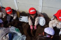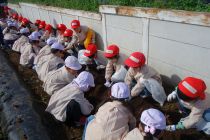 年中さんと年長さんで近くの畑にお芋ほりに出かけました。出発する前には、掘る芋の名前や種類、どんな風に育ててきたか、どうやって掘るのかお話をよく聞いてくれていました。実際に畑について掘り始めると、想像以上の大きさのお芋にびっくり!掘っても掘っても出てこない、こんな大きいいも初めて!と色々な所から歓声が上がります。1年間かけて大切に育ててくれたからこんなに立派になったんだねと食育に繋がる経験もできました。今日はみんなのお家でお芋を食べる人が多いのかな。