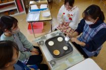子どもたちが登園していない土曜日を使って、先生たちはお料理活動の実習をおこないます。いきなり子どもたちの前で始めるのではなく、活動を進める中で、子どもたちに伝えやすい言葉や、見せ方を確認する意味で、最初から最後まで子どもたちと同じことをやってみます。材料の量や道具の配置、机の上の並べ方など子どもたちが活動しやすい環境設定を決めていきます。今回はホットケーキの実習でしたので、最後は先生たちで完成したホットケーキを食べて終わりました。これもお仕事です(笑)
