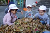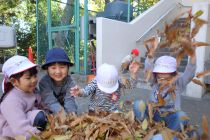園庭のクヌギの木の葉っぱが最近の寒さで一斉に落ちてきました。カサカサで軽い葉っぱは雪のようです。